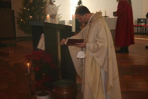 In der Predigt nahm Pfarrer Jung das Evangelium in den Blick. Die Sterndeuter zur Zeit Jesu suchten einen besonderen Stern, ein Zeichen am Himmel, das auf einen neuen König hinweist. Er fragte, woran wir unser Leben ausrichten? Bin ich ein Zeichen für andere? Wir finden „den Stern“ in der Krippe. „A Star is born“, heißt es in einem berühmten Musikfilm, ein neuer Stern geht strahlend auf: Jesus Christus. In der Krippe finden die Sterndeuter das, was sie suchen und zwar in einem ärmlichen Stall. Deren Gaben, so der Geistliche weiter, seien eigentlich unpassend für die arme Familie von Jesus; dieser würden eher Brot; Milch oder ein wärmendes Fell nützen. Die Gaben der Weisen scheinen fehl am Platz. Sie verweisen auf einen König, auf Gott, einen Heiland und Arzt. Das Motto der Sternsinger-Aktion bekomme so eine neue Tiefe und Sinn. Jung berichtete über seine Erfahrungen, die er während seines Senegalaufenthaltes gemacht hatte. In diesem Land ist das Gesundheitssystem marode und aus Armut nicht finanzierbar. Die Krankenstationen seien nur sehr dürftig ausgestattet. Kirchliche Einrichtungen sorgen oft für kostenlose Behandlungen sowie für nötige Krankentransporte. Das Gold des Königs aus dem Evangelium, stehe für Geld, das den Armen hilft und sicherlich auch der hl. Familie auf der Flucht nach Ägypten geholfen hat. So sichern auch unsere Spenden eine medizinische Grundversorgung für arme Menschen. Der Weihrauch durchdringt die Häuser mit seinem Duft. Er bezeugt die frohe Botschaft der Menschenfreundlichkeit Gottes sowie unserer Mitmenschlichkeit und Solidarität. Das Anwenden von Weihrauch darf nicht als Selbstbeweihräucherung verstanden werden, vielmehr als Segenshandlung:  C + M + B schreiben die Sternsinger mit Kreide an die Türen der Menschen, d.h. lat. Christus mansionem benedicat und ins Deutsche übersetzt Gott segne dieses Haus. Der alte Arzneistoff Myrrhe diene der Gesundheit, ebenso wie es moderne Medikamente tun. Pfarrer Jung plädierte in diesem Zusammenhang für eine gerechte Verteilung von Impfstoffen. In den sog. Entwicklungsländern haben oft weniger als 10% der Menschen die erste Impfung gegen Covid erhalten. Unter diesem Aspekt erhalte das Motto „Gesund werden – gesund bleiben“ eine besondere Aktualität.